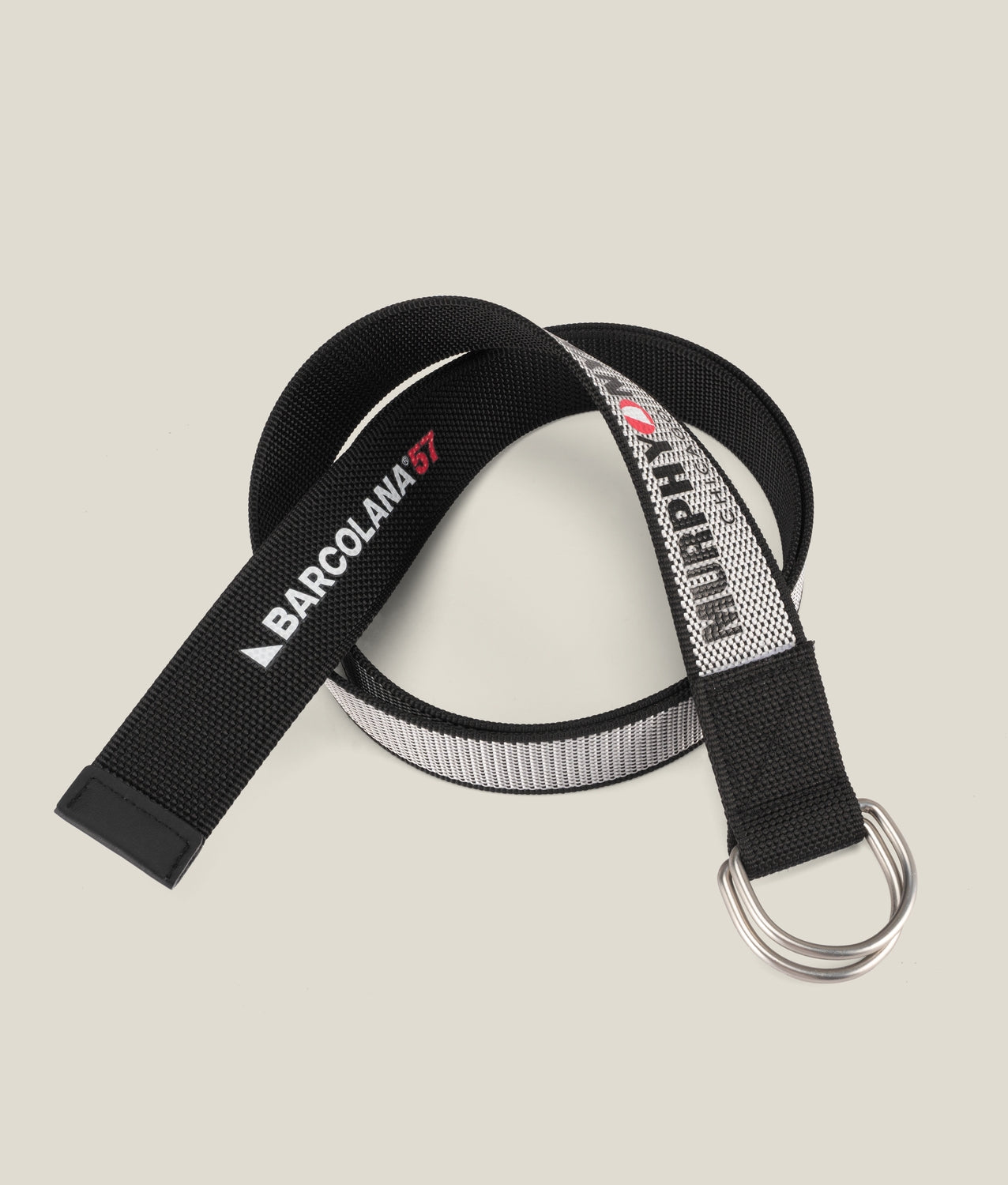 Reversible men's belt made of durable nylon with an aluminum buckle. Barcolana®57 edition, featuring the elegant Jet Black tone of this collection. Ideal for various uses, both in the city and with a sporty look. Features Murphy&Nye® logo print along the entire length.