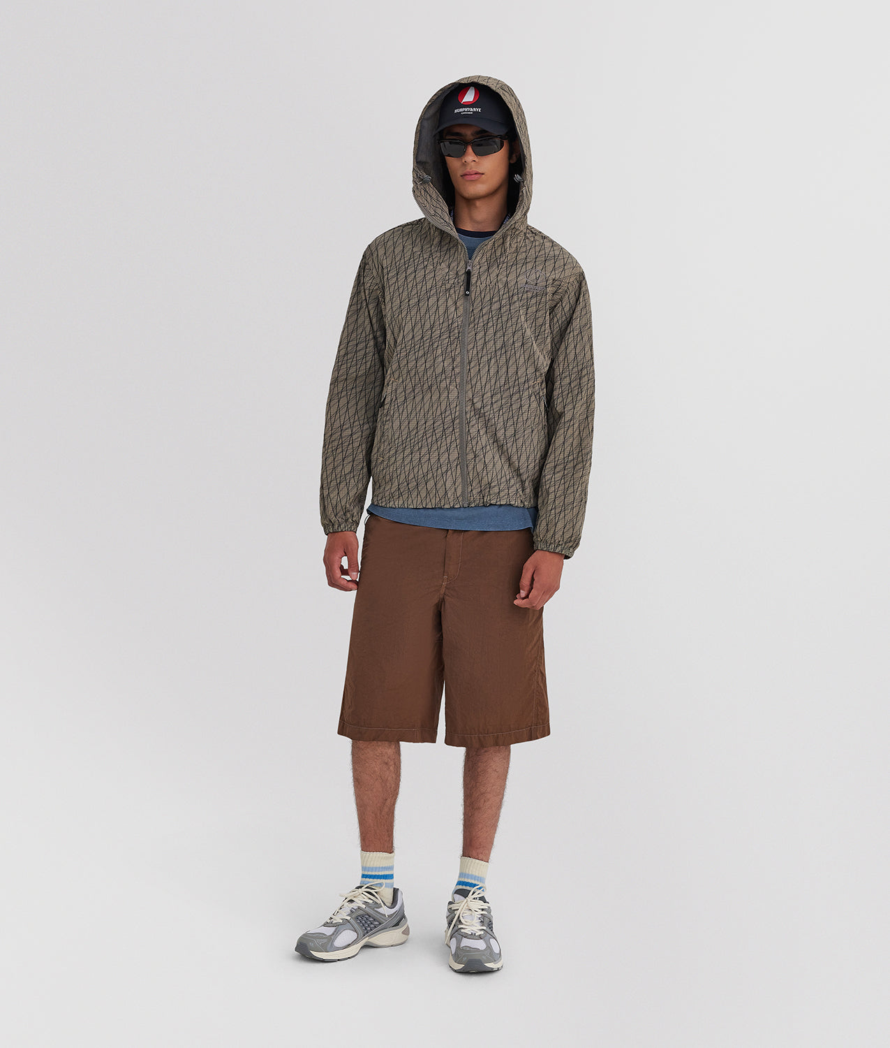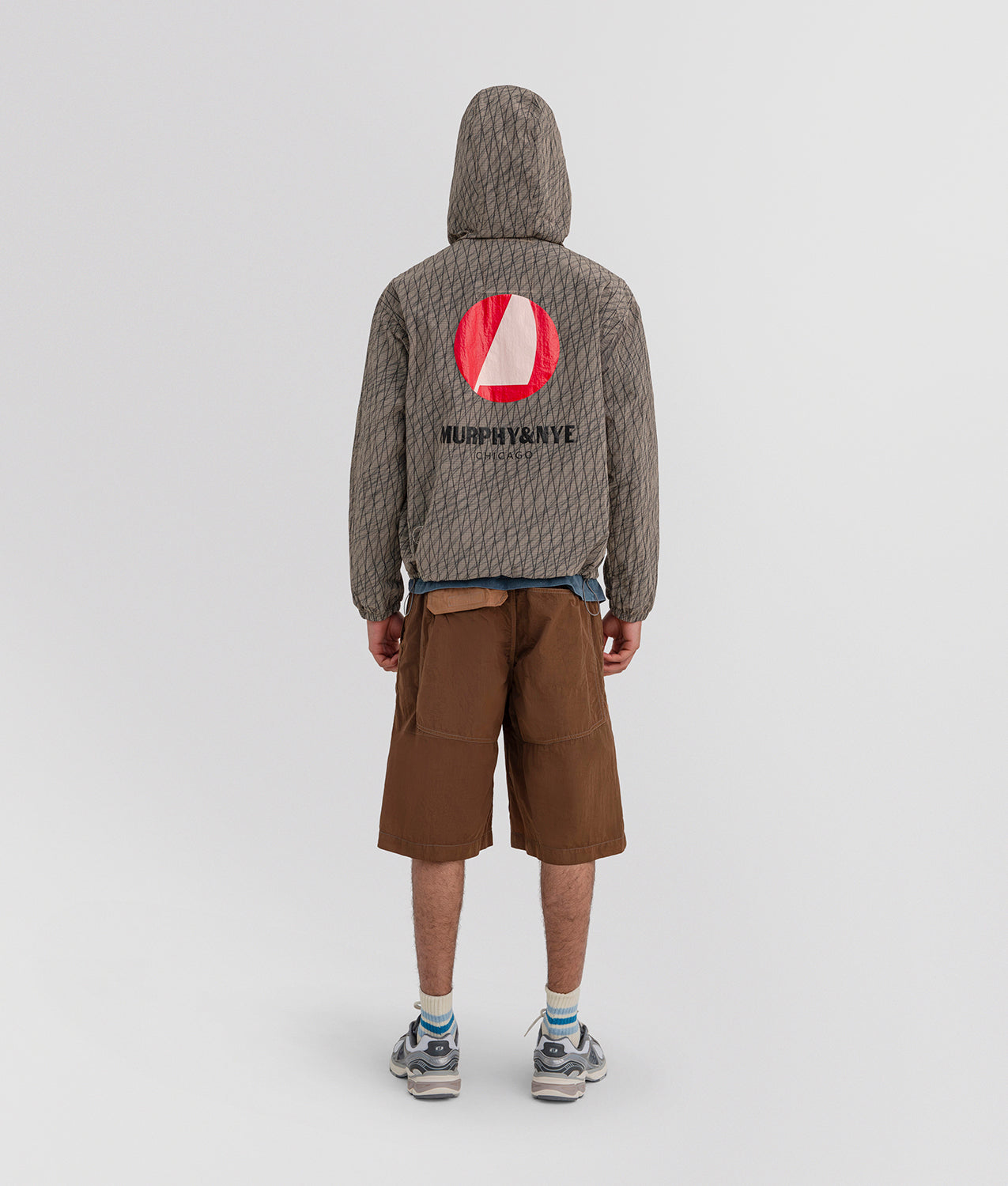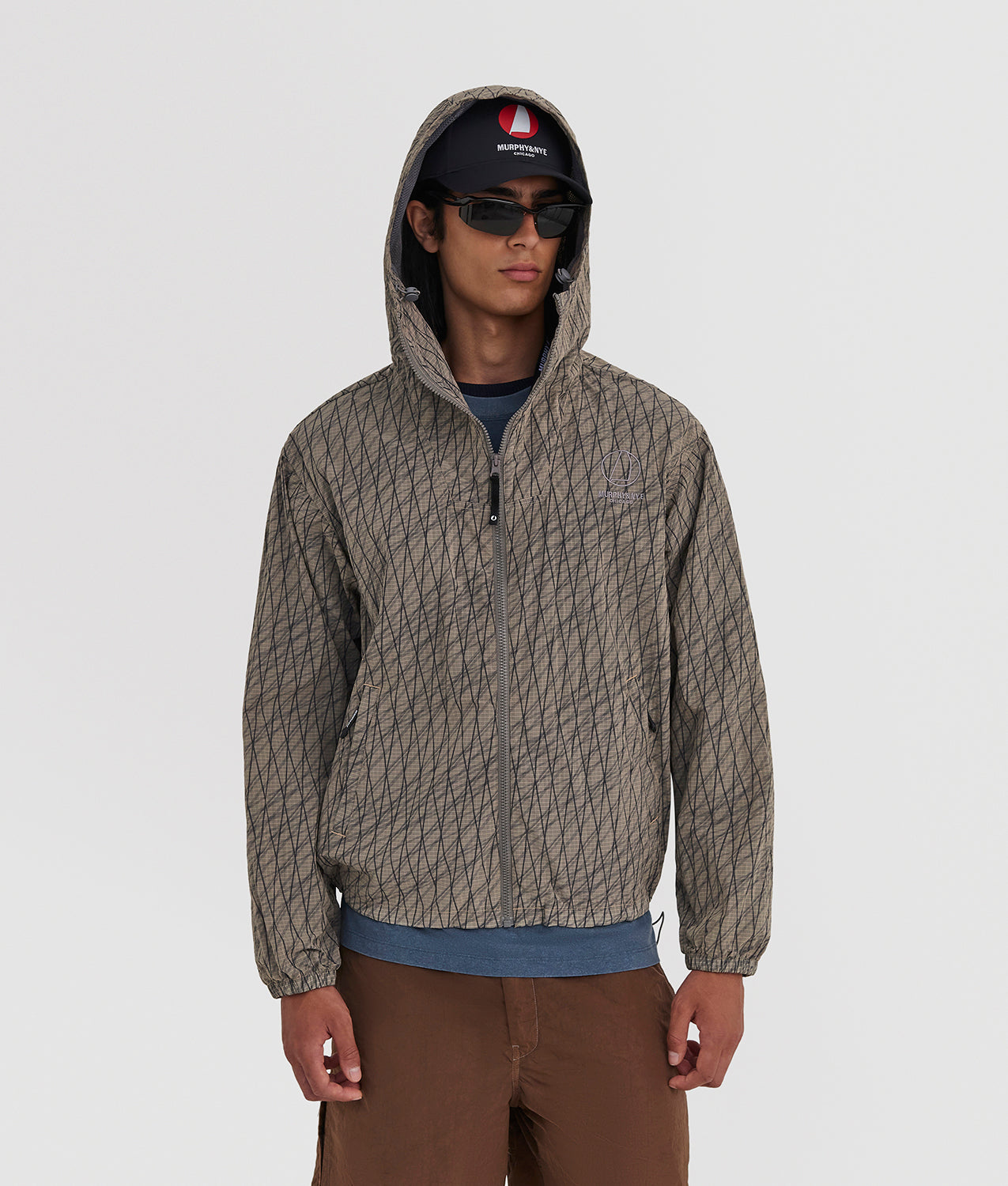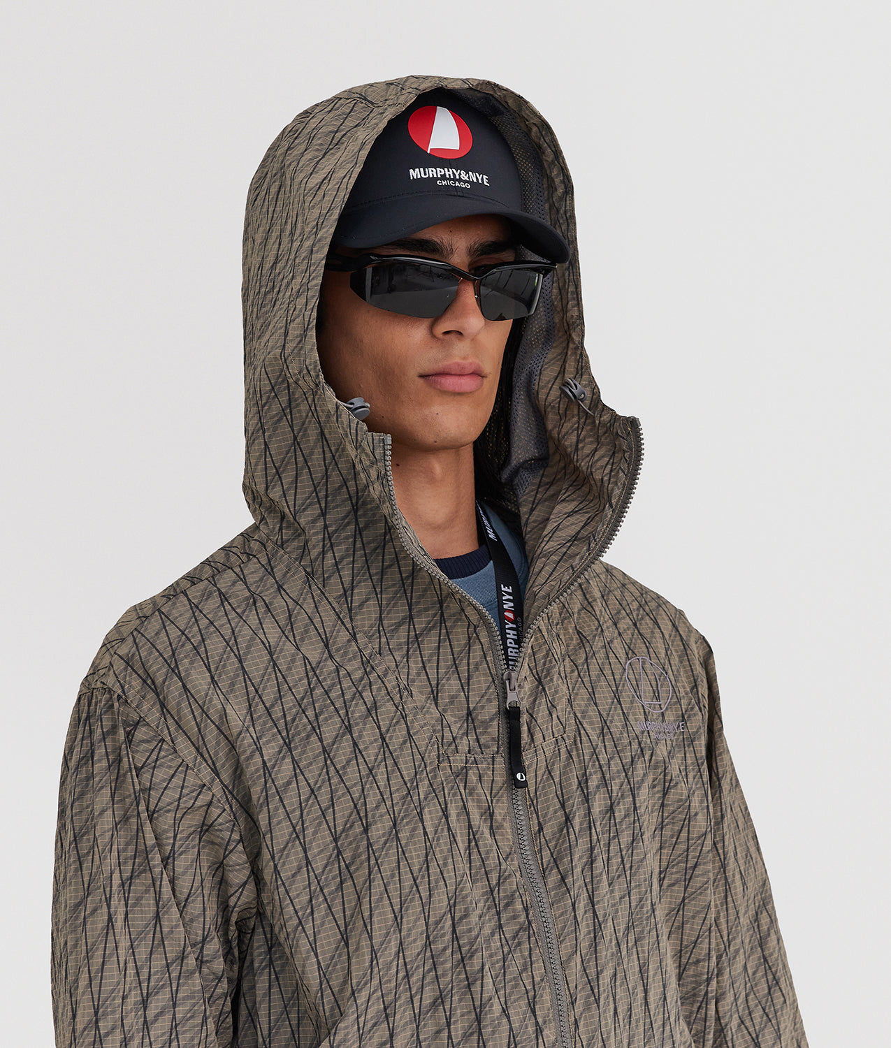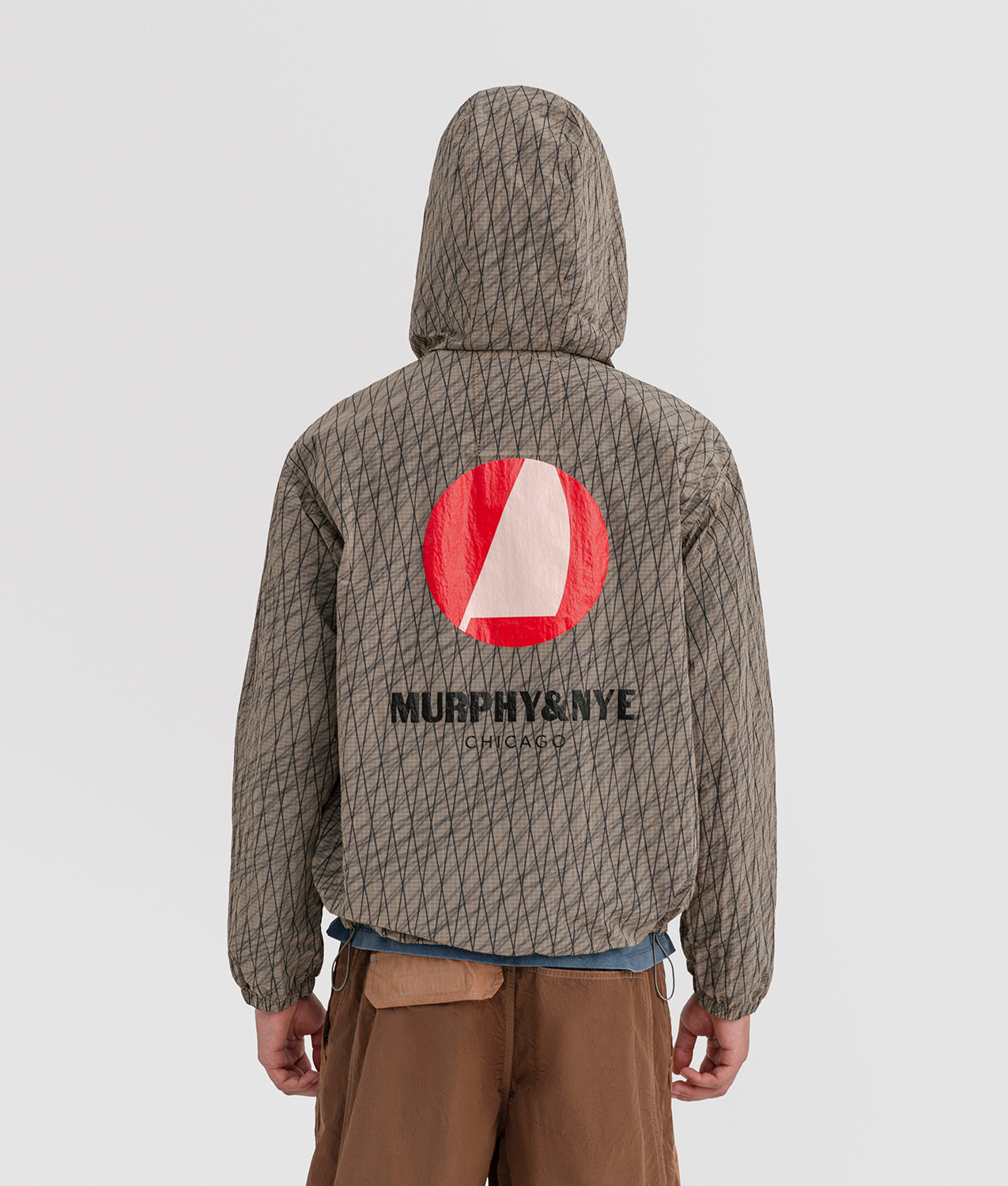 Beam Jacket Murphy & Nye, a full-zip anorak-style jacket with hood, made from garment-dyed technical ripstop fabric for a lived-in, material look with a contemporary character. The high collar and technical construction provide protection and functionality within a clean, modern aesthetic. The front zip with custom puller, the applied pocket with zip cover and reinforcement bartacks ensure practicality and durability. Mesh lining on the body and hood guarantees breathability, while elastic bands and stoppers at the hem and hood, together with elasticated cuffs, allow for an adjustable fit. The design is completed by the contrasting Murphy & Nye logo print on the back, a bold and recognizable graphic signature.