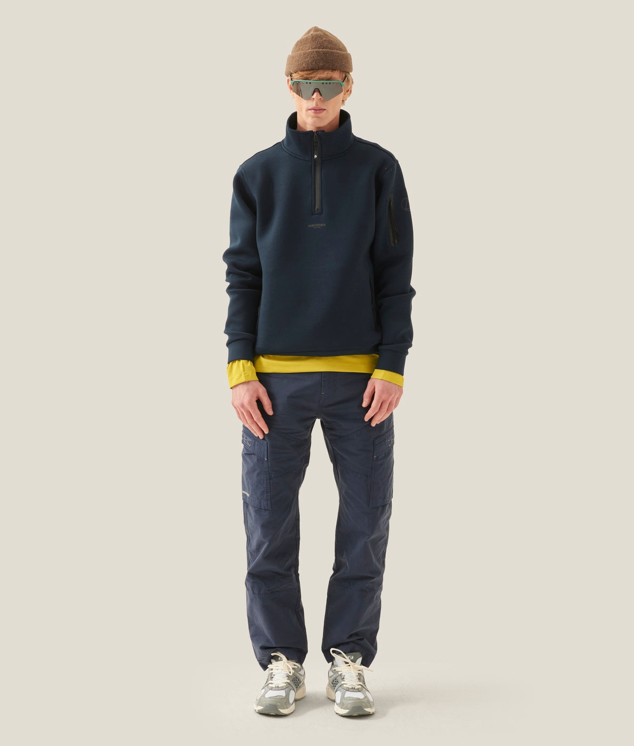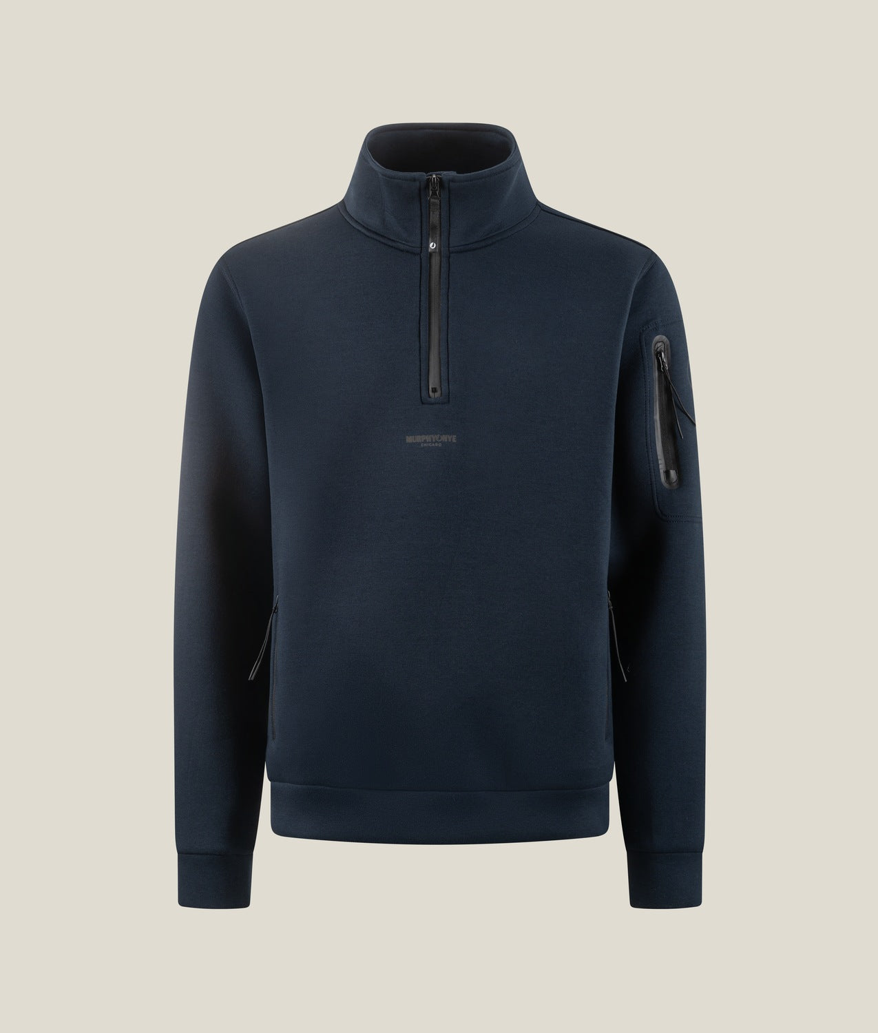 Men’s half-zip sweatshirt made from technical, stretch scuba fabric, designed to ensure comfort, performance, and a sporty look during outdoor activities and life at sea. The high-performance material offers full freedom of movement and a soft feel against the skin, while the front zipper with rubberized finish adds a modern touch and protection from the elements. A zippered sleeve pocket provides secure storage for small essentials, and reflective details featuring the sail logo and Murphy&Nye® branding enhance visibility in low-light conditions. The custom zipper pull completes the garment with a functional and distinctive touch.